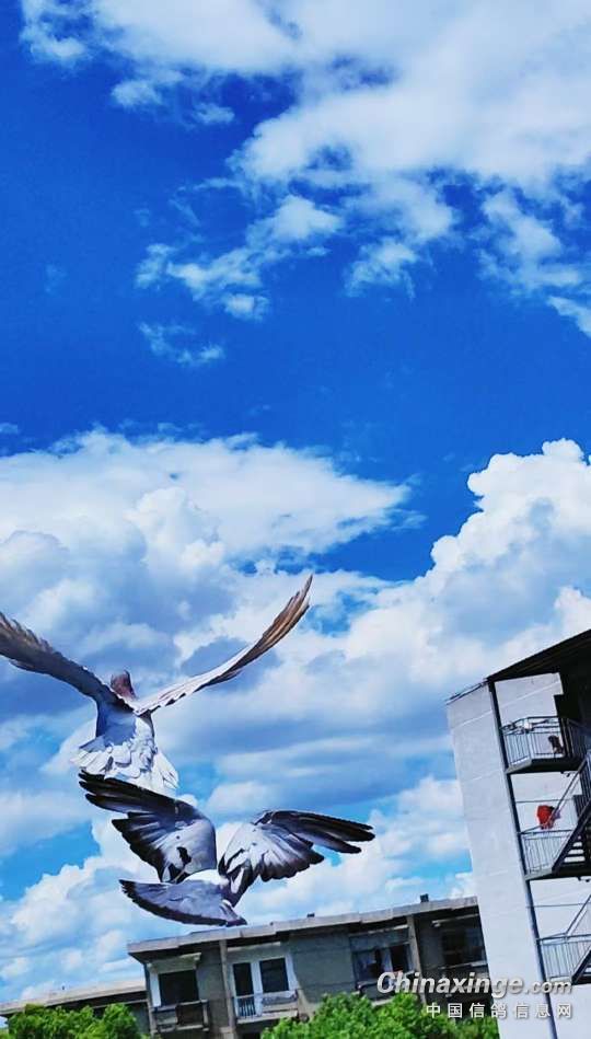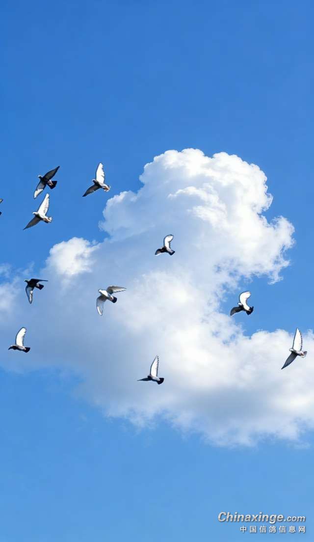作品说明: 今天送走了四羽打公棚的鸧子,留下的是本地区秋大赛鸽由父母鸽带飞,鸽群直冲云霄,背着鸽哨的是领航员。今天家飞起高节,高空中的鸽子像画素描线条似的在蓝纸上盘旋,一圈又一圈,太美了。