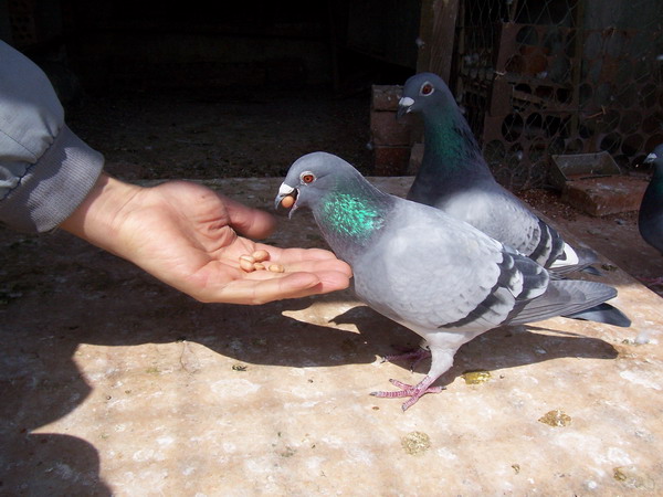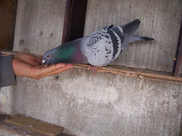 网友对此都感兴趣,本人也来凑上几句子。大凡肯近人讨食的鸽子,一是品种性格使然决定;但亦不泛表现它的活力,一般飞上手能感觉到它的脚大多很暖,从中多少能看出它的状态;各位,还记得吗?上海一位养鸽大家赛鸽归巢时,几乎都是唤鸽直接上手捉住打钟的,此乃天(鸽)人合一,获胜之兆哇! |