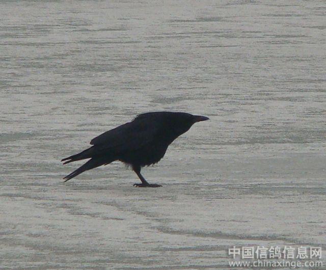 不知这只乌鸦在冰面上扭着脖子向天上看什么,天上空空如也。