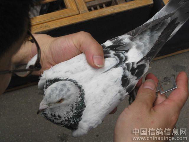老鸽友的白鸽,500KM当日18点过回的,可惜没进奖啊!本人也很喜欢这样的白鸽,跟老鸽友谈了下,要价太贵,可惜了!