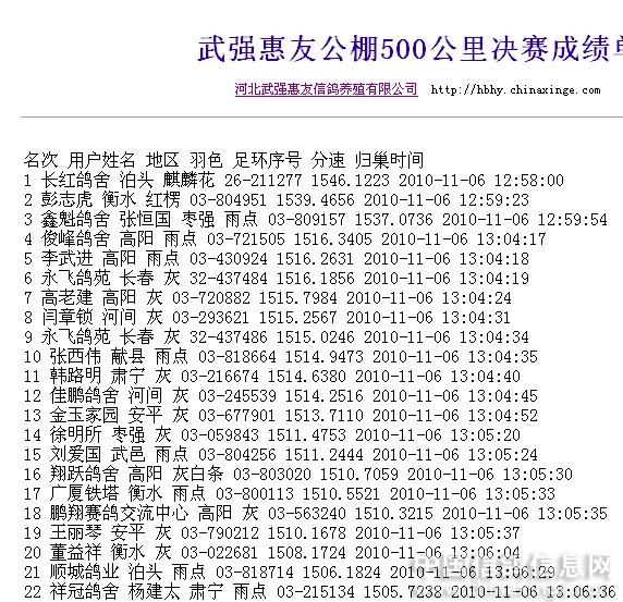 | 作品说明: 2010年11月6日衡水市武强县惠友信鸽公棚于2010年11月5日 12时30分集鸽 上笼 次日早上7时38开笼 在经过了494.6303公里的长途跋涉后 冠军于2010年11月6日12时58分到达公棚 前22名分速都在1500以上,前52名都在1400以上,前125名在1300以上。这个数字不能说是中国历史上 秋棚赛分速最高的,但是也可以排在前5名 。我们可以分析一下,出现高分速的原因(1)鸽子的品种好 质量高{这个也是可能的 但是不可能的是125只鸽子 品种质量都很高}(2)养功好{这个嘛!我没有去过公棚,不知道养的怎样} (3)顺风 {我知道顺风也是提高分速的一种自然原因吧} 是不是有某种超自然的力量在帮助呢?太邪乎了 我相信没有的 哈哈 给大家开个玩笑 说正事吧! 为什么国内的很多大工棚 像 惠翔 BOB 中荣 的鸽子没有飞出这样高的分速呢?是因为品种 质量 养功 还是自然条件 不如武强惠友公棚呢? 我们可以去调查其中的奥秘。比赛结束后没有及时的打出迟归鸽的清单 是没有迟归还是别的原因,公棚负责人没有解释…… 现在很多网友在公棚留言板上留言,批评公棚的网友 很多都遭到了恐吓…… 高分速的背后是否有什么猫腻 公棚的恐吓背后是否有不可说出的真相………… 武强惠友公棚网址http://gdgp.chinaxinge.com/default2.asp?gp_id=431 |