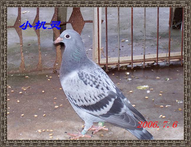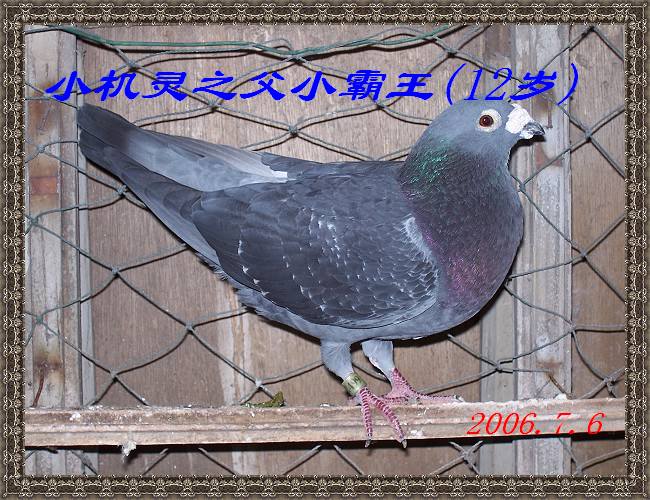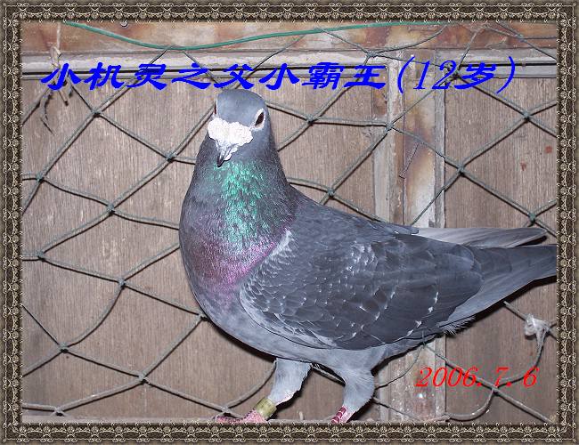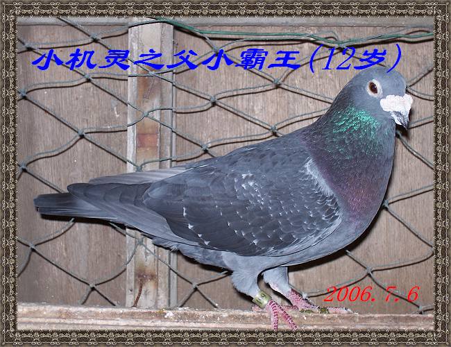 当年父鸽从常熟陆良方鸽友处借来时,已有10岁,秋季配对雌鸽产蛋无精,经过拆配,静养一冬,来春作配第一窝即出两雏,老来得子,喜上眉梢。但雏鸽长得比较单薄,一点也不起看,心中着实有点悬,然待到十多天,偶尔去看看小雏长得是否壮实点,竟发生了一桩少有的趣事,其中一羽大雏气势汹汹,呼呼啄人,临了还来一记翅膀,竟然把自己打了个翻身,其表现哪象一羽乳臭未干的小毛团,个性独特,脾气刚烈,从性格来看是块好料,于是笔者打心眼里喜欢,就给定名为“小霸王”。“小霸王”长得和父鸽一样,只是小了一号,个头有模有样,毛羽紧密、柔软、翅条美观、犀利,出棚就十分的聪明、机灵,尚不会飞时,谁想抓它,就往黑暗的角落里钻,自我保护意识特强。长大后举止沉稳,气宇轩昂,霸气突显,平日吃食往槽亭里一站,连大雄鸽见它也怵,不敢与其争食,自有一股王者风范。