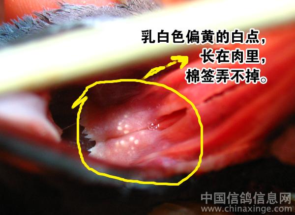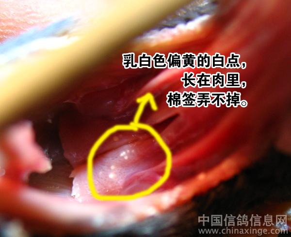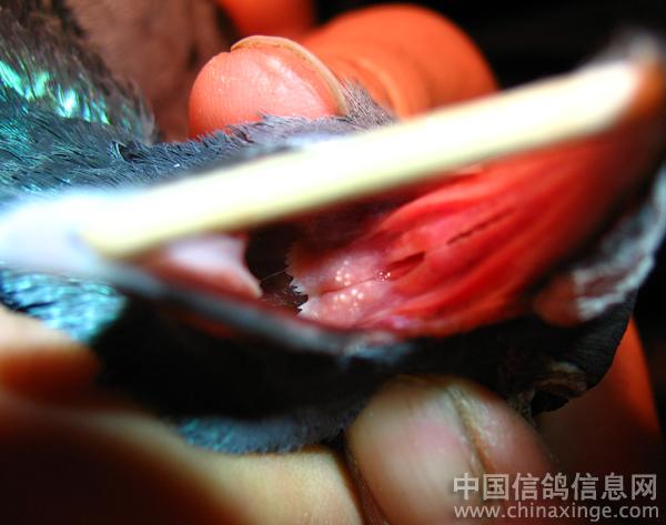 其实这就根本不是病,让它喂几窝幼鸽就消失了。是口腔分泌物在上颚表皮组织内的沉积,人的肉眼看是一个个的白点,白点在表皮组织内,只有用针挑开才可以取出。很多鸽子都有,并不影响比赛。 |