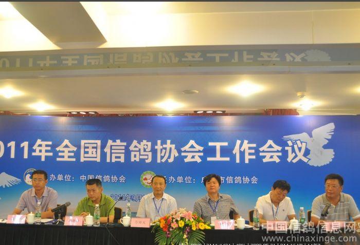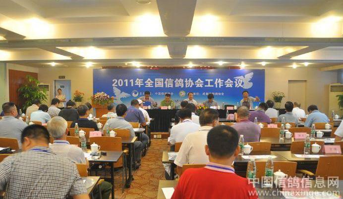 2011年全国信鸽协会工作会议9月1日至2日在四川成都市召开。本次会议由成都市信鸽协会承办。各省、市、自治区、行业鸽协及部分合作单位与媒体等共70多人参加会议。国家体育总局社体中心副主任、中国信鸽协会副主席张怡,四川省体育局副局长、中国信鸽协会副主席方沛元,国家体育总局社体中心业务三部主任、中国信鸽协会副主席尹国臣,国家体育总局社体中心业务三部副主任、中国信鸽协会秘书长杨树刚,成都市体育局副局长冯晓钟,成都市信鸽协会主席辜建明等出席会议并在主席台就座。大会由尹国臣主持。