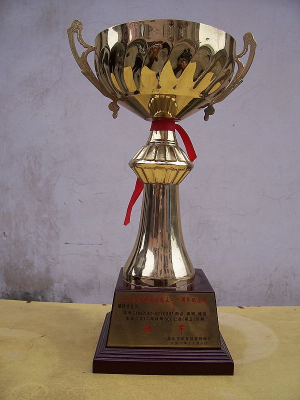 昆山市信鸽协会成立20周年纪念杯,由昆山市体育局特别颁发,这是一尊十分珍贵的奖杯,被缪耀华鸽友夺得,这是四年前的事了。这次他参加“五省一市”北京联赛,又得了联赛21246羽中的1000公里级143名,可是由于背光摄影,加上电视台记者们等着我们拍摄北京联赛的优胜鸽,匆匆忙忙的拍了一张,还是没有照好!
