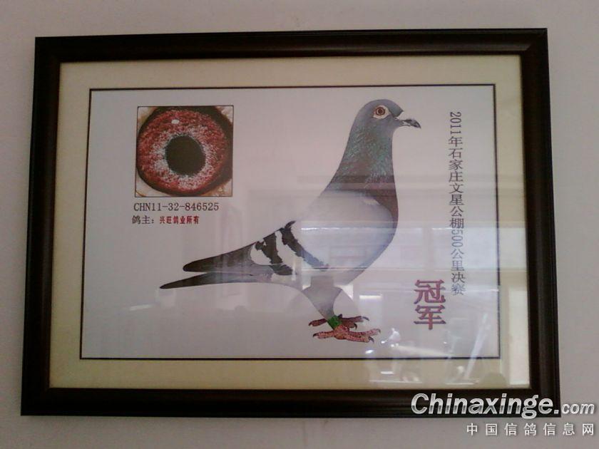 作品说明: 兴旺鸽业,鸽主-张军,CHN11-32-846525在2011年石家庄文星公棚500公里决赛中获得---冠军。