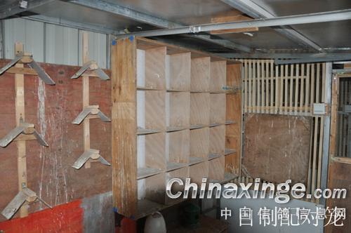 改造后的鸽舍内部、部分鸽子,分三间:赛鸽棚、种鸽棚兼幼鸽棚、保姆棚(种鸽棚)