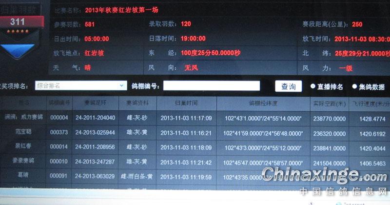 2013年11月3日昆明古镇赛鸽俱乐部红岩坡站比赛成绩.......