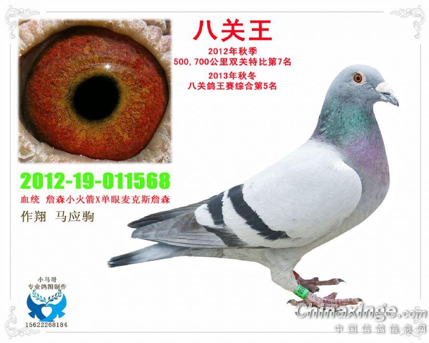 作品说明: 历时两个多月,一场秋冬八关赛事降下了帷幕。本舍指定一羽CHN12-19-011568参加该赛事。在度过无数个让人揪心的日日夜夜后,终于在12月21日这天胜利完翔八关比赛。个中经历,值得回味。养鸽三十载,这回将在我的养鸽生涯中画上隆重宽厚的一笔。 八关比赛详细介绍: 第一关:10月11日江西南康300公里,集鸽1432羽。获第82名,分速1300米。 第二关:10月17日江西赣州340公里,集鸽901羽。获第201名,分速1293米。 第三关:10月25日江西吉水500公里,集鸽1043羽。获第170名,分速1363米。 第四关:11月2日江西吉水500公里,集鸽795羽。获第300名,分速383米。 (此鸽 在这一关中枪了,子弹从前胸进,翅膀底下出。于第二天晚上6点28 分回,如果再迟点,就失格了。当我把它捧在怀里时,伤口的血已干了,心中感动不已。) 第五关:11月16日江西永修700公里,集鸽450羽。获第155名,分速589米。 (此鸽在这一关带着伤体,还能顺利完翔700公里的赛事,我个中付出的努力,感概万千呀!你懂的) 第六关:12月2日江西南康300公里,集鸽1538羽。获第256名,分速1218米。 第七关:12月9日江西万安400公里,集鸽858羽。获第542名,分速499米。 (因上一关的顺利归巢,思想麻痹了,放松了管理,结果可想而知。养鸽就这样,千万不能有一丝的疏忽,真是太深刻了。) 第八关:12月20日江西樟树600公里,集鸽755羽。获第174名,分速885米。 总成绩:2013年秋冬八关鸽王赛综合排名第五名,平均分速941.78米。 获奖鸽介绍:CHN12-19-011568雄,羽色灰,黄眼。2012年秋季500,700公里双关团队特比环单鸽赛综合第7名奖鸽。2013年再度奋战秋冬八关赛并胜利完翔。血统为台湾飞事达竞翔育种中心姜先生的詹森小火箭配我们广州当地较有名的单眼麦克斯詹森回血母所出。话不多说了,看图吧!