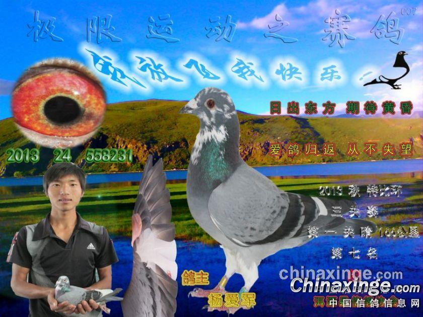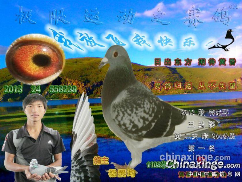 作品说明: 辛苦付出总有回报!过去了一年赛季 养鸽人又忙碌着为下一季做准备,脚 步永不停歇! 图三: 洱源县信鸽协会2013秋266公里打奖 赛冠军 羽色:绛 性别:雄 眼砂:黄 血统:桑杰士&考夫麦 图二: 2013洱源县信鸽协会秋特比环三关赛 第一关166公里获10名,第二关266公 里获第一名,父亲为洱源县信鸽协会 首届366公里归巢 羽色:雨白条 性别:雄 眼砂:黄 环号:2013-24-558238 图一: 2013洱源县信鸽协会秋特比环赛第一 关166公里获七名,第二关266公里迟 归,同窝平辈266公里龙骨受伤,夹蛋 归巢,此鸽母亲及平辈均266公里归 巢,属吃苦耐劳稳定鸽系。 羽色:浅斑白条花 性别:雄 眼砂:黄 环号:2013-24-558231 血统:南诏双奖号&慕利门