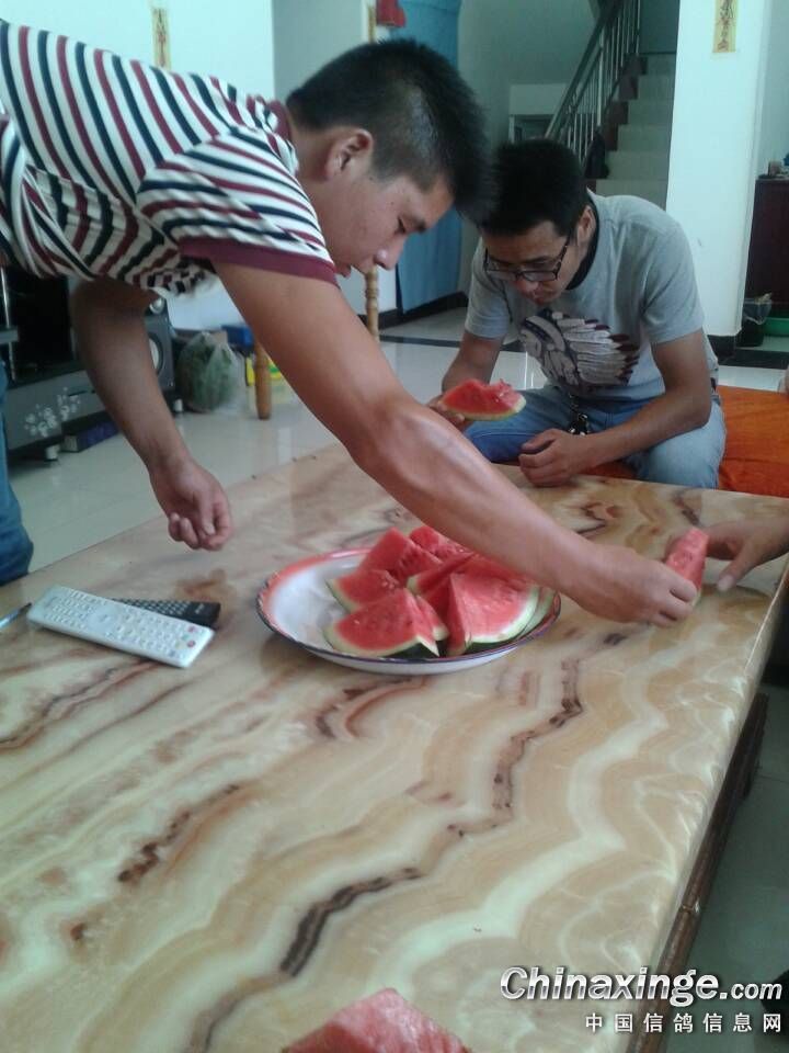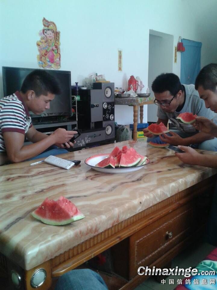 首先给3分 在说句:吃西瓜不喊下鸽友啊!!嘻嘻 开个玩笑啊!我是江苏鸽友祝照片上的几个鸽友都能飞出好成绩!QQ18384746 |