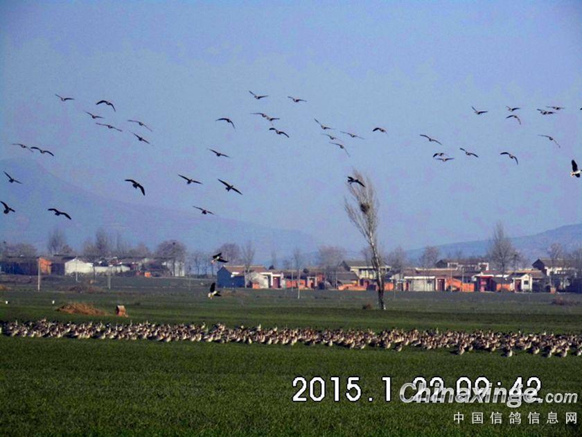 鸽协会在此放鸽子,当骑车走近时才发现是一群雁,虽然不知道它是什么雁,总之数量