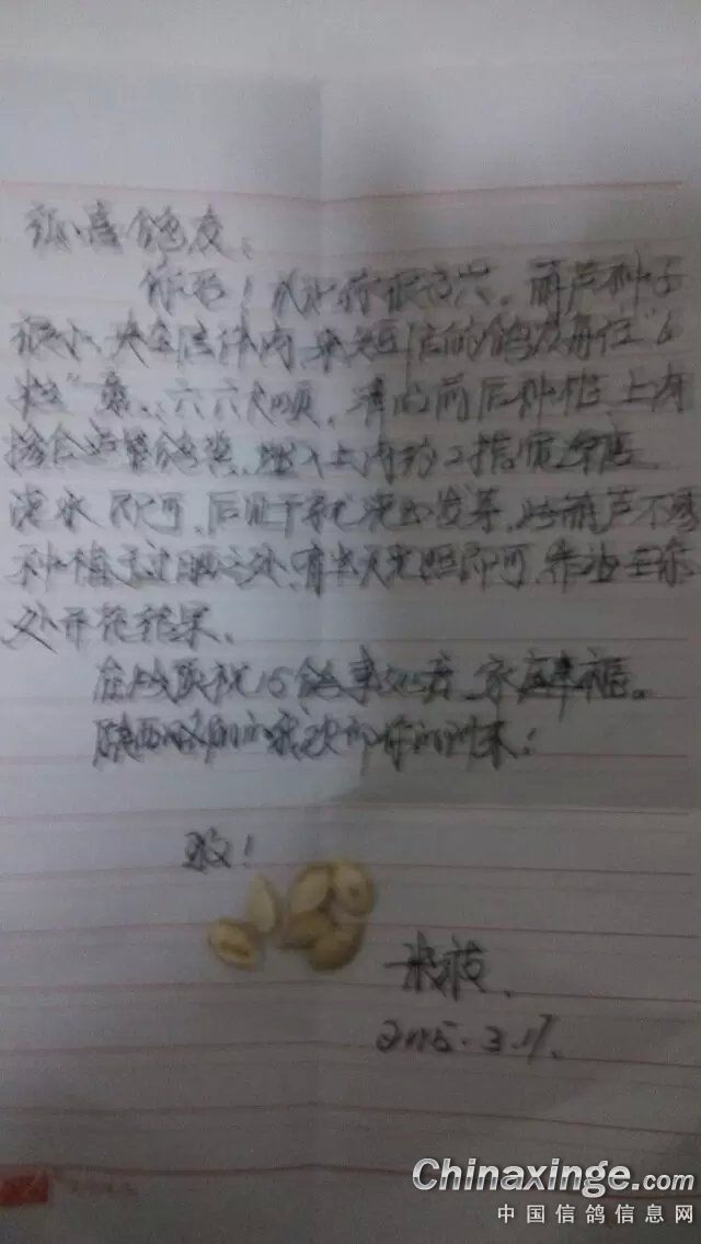 作品说明: 鸽友的来信,本因为我们距离这么远,大哥不会把种子,邮过来,结果昨天收到来信,
