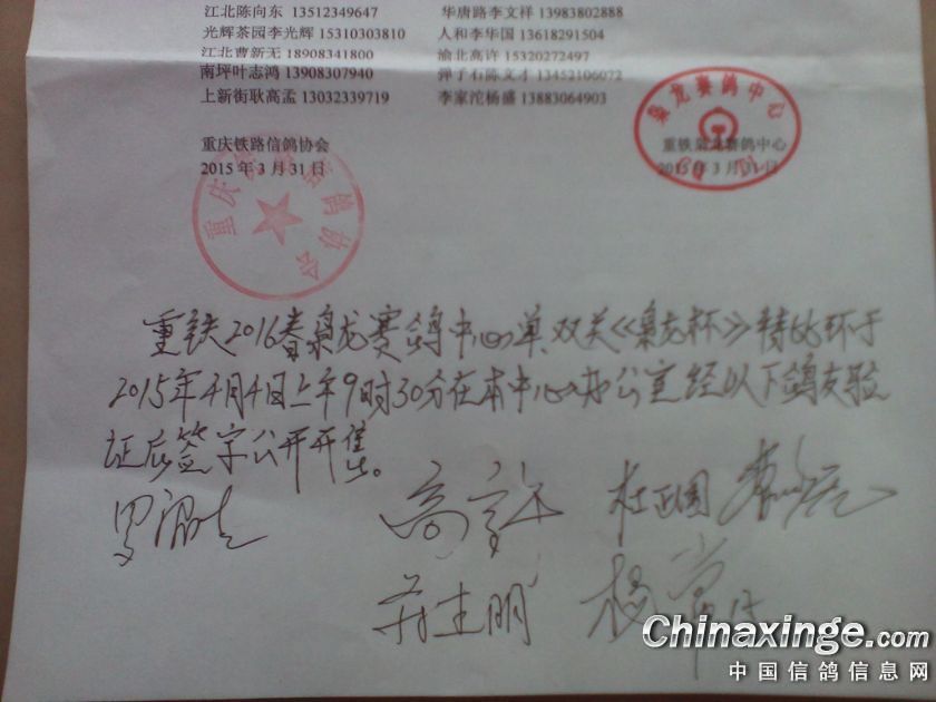 作品说明: 重铁总会枭龙赛鸽中心2016年春季单双关特比环保底七万元章程请上重庆赛鸽网www.cqsaige.cn查阅,4月4日开售。50元-套,110元-套,200元-套。请鸽友相互转告为感。 如有不明请致电13110274432