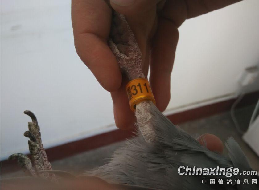 作品说明: 今天中午12:40和同事正准备去吃饭发现单位门口有只鸽子。仔细一看带着橙色的14年足 环和一个黑电子环。想应该是公棚路训的鸽子。我就走过去赶它起来,但是它只能走飞 不起来了。应该是受伤了。就把抓了起来才发现它的翅膀受伤羽条杂乱,这样的鸽子我 是不会拿去训放,家飞都困难。对着环号查了下我们这的春棚。是大爱飞天的鸽子找到 了鸽主的名字《伊犁铁人鸽舍》。希望它主人能看到2014-30-311106。