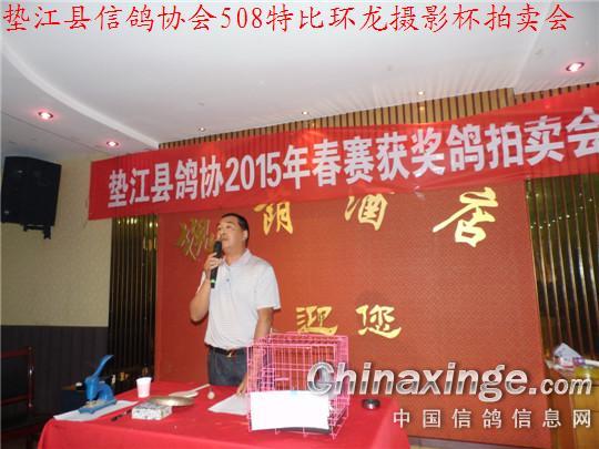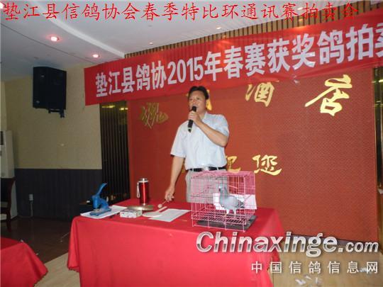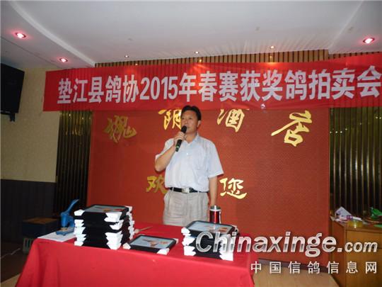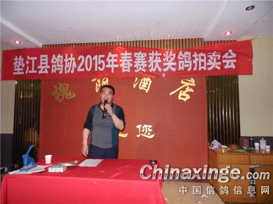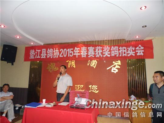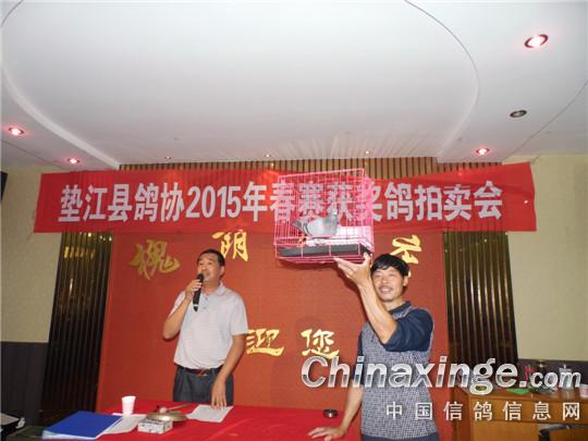 拍卖会由组委会成员,垫江县信鸽协会常务副主席李行权主持。议程是:一、组委会成员碰头会,研究拍卖会分工事项,布设拍卖鸽。二、颁发归巢证。三、信鸽协会主席刘天成致开拍词,叙述拍卖规则:起拍价,每羽500元,流拍鸽由鸽主交10%的组织费,自行拿回,3000元以下,举牌一次加100元,3000元以上,举牌一次加500元……。代表组委会讲话,并且感谢龙摄影旗舰店王总,今年首届“龙摄影杯”圆满成功,卖出奖环20万。四、龙摄影旗舰店老总王晓东颁发赛鸽像框。五、垫江县信鸽协会主席刘天成执拍春季通讯赛、特比环各奖项前15名优胜鸽。特邀请原重庆铁路局忠县信鸽协会主席――张荣,执拍“龙摄影杯”各奖项前20名优胜鸽。六、聚餐。七、颁发奖金。