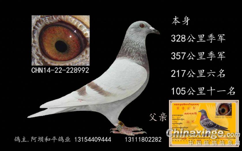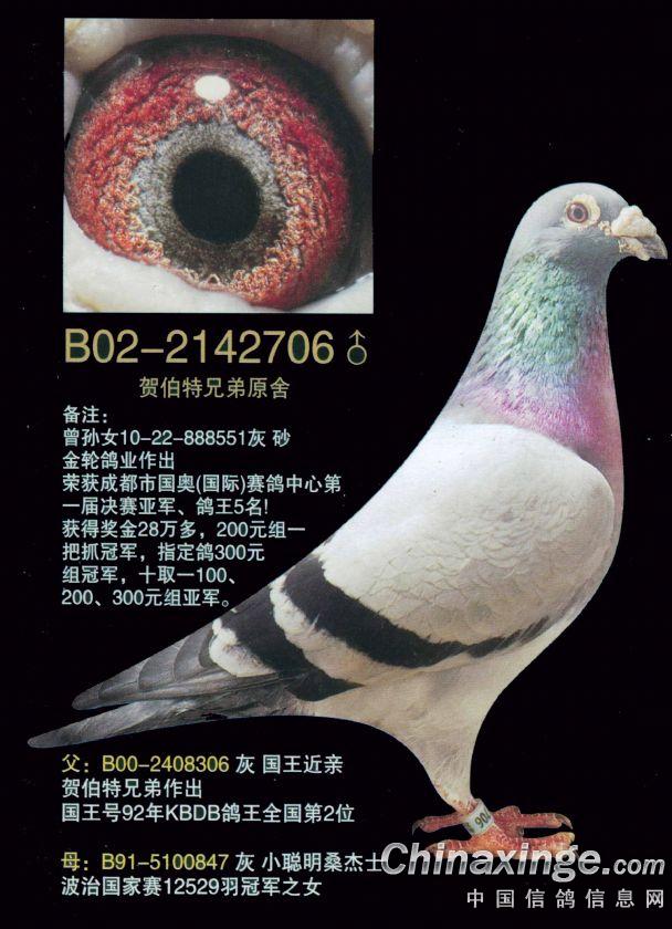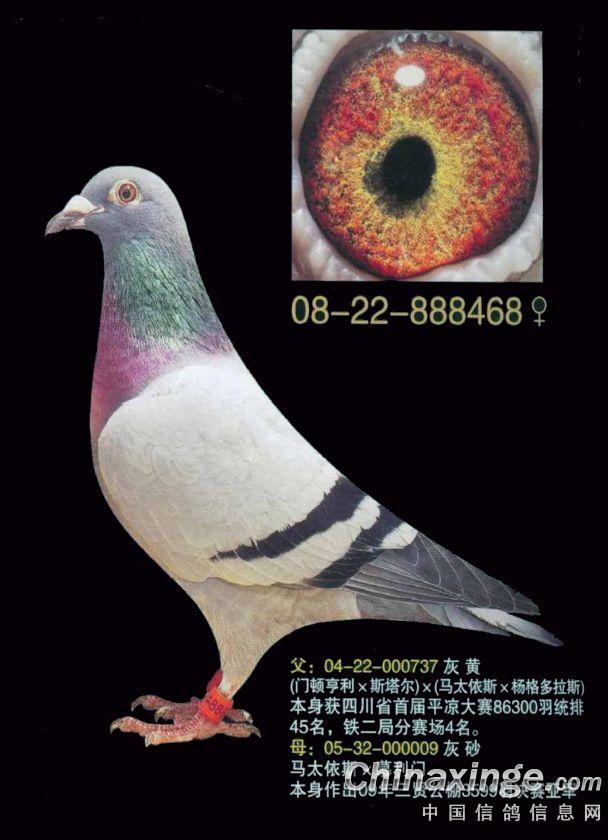 2008-22-888468 父2004-22-000737灰(门顿亨利x斯塔尔)(马太依斯x杨格多拉斯) 本身获四川省首届平凉大赛86300羽统排45名 铁二局分赛场4名. 母2005-32-000009灰 马太依斯x慕利门 本身作出。阳光公棚决赛47名。 三贤公棚决赛亚军