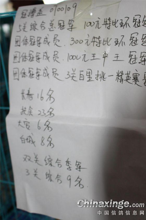 (比赛当日天气十分恶劣,沿途一路有雨,南风4-5级,阵风达到6级,北方赛道,鸽子由北至南一路逆风,第一梯队的鸽子飞行近9小时30分钟归巢,当日参赛集鸽羽数145羽,有效归巢27羽,其中本鸽业前10名进奖4羽,0700109.0700102.0701027.0701045,五关综合成绩包揽参加组项所有冠军,王中王杯冠军,300元组冠军 ,100元组冠军,以上3项团体冠军,汽车大奖冠军,百里挑一冠军,聚宝盆冠军,此外获得以上项目多项亚军,季军。