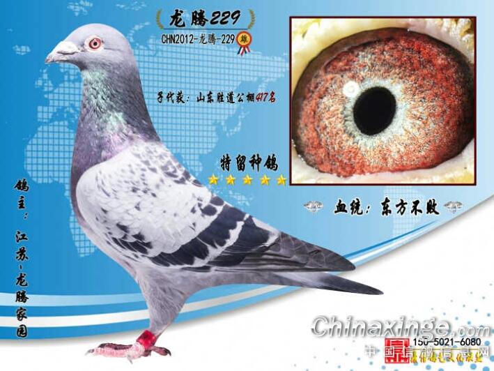 图上所发鸽子均为龙腾-229配花凡龙雌所出,出6归5,取得2015年公棚417名是花鸽。