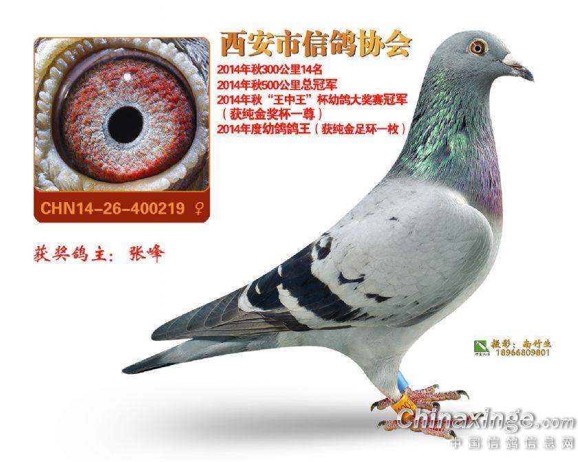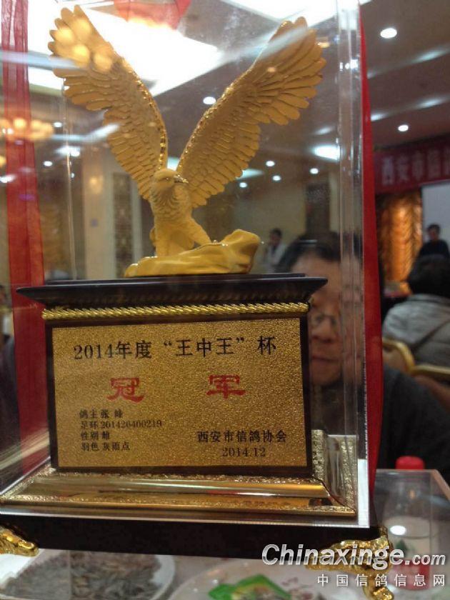 作品说明: 2014年西安市信鸽协会秋季“王中王杯”幼鸽特比环总冠军得主张峰2003年张峰有缘高价引进一羽曼德斯血统灰沙雄鸽取名【圣斗士】,此羽种雄子代从2004开始作育每年子孙后代,代代高位入赏已斩获冠军15余前十不下50羽保守估计赢取奖金七位数以上 2013年八仙赛鸽俱乐部500公里大奖赛当天天气恶劣沿途有雨鸽会当天归巢百羽张峰的一羽环号2013-26-201170勇夺冠军领先亚军40分钟同窝同场6名,证实【圣斗士】这个超级黄金种雄的育种价值。 2014年10月26日早晨7点50分,西安市信鸽协会秋季“王中王杯”幼鸽特比环大奖赛准时开笼,经过六个多小时的飞行,张峰的一羽砂眼灰雨点雌鸽(足环号:2014-26-400219)以1287.713米/分的分速,夺得2014年“王中王杯“幼鸽特比环大奖赛500公里决赛的冠军,王中王冠军又作育2015年的“王中王杯“幼鸽特比环大奖赛季军
