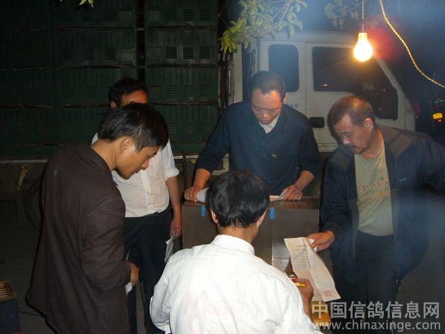 作品说明: 4月25日,常德市信鸽协会2008年春季300公里大奖赛如期进行。连续的晴好天气,鸽友们的心情都非常舒畅,对第二天的比赛充满了希望。晚上8点正集鸽工作正式开始,鸽友们早早地来到集鸽现场,交费、排队扫描入笼,赛前的各项准备工作紧张而有序的进行。晚上12点半,全部集鸽工作结束,集鸽近700羽。带着鸽友们的希望,运鸽车踏上了漫漫征程。值得一提的是在今天的集鸽现场,湖南省信鸽协会秘书长,省体育局群体处副处长邓建跃兴至勃勃地来到现场观摩并指导了此次比赛,他们的到来给比赛增添了不少庄重和热闹的色彩。