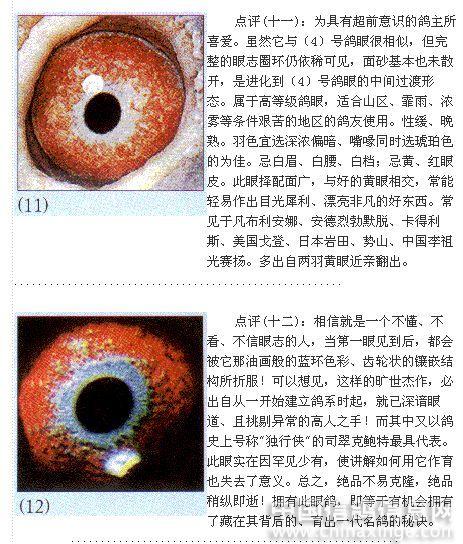 看了所有的鸽眼图,本人对图(12)叫为偏爱!本人有幸在1987年得一羽类似此眼灰白条雌鸽。育出的后代在500公里基本上没丢过,后因多种原因在1988年就放弃养鸽。今天又见此鸽眼!不免有点..............