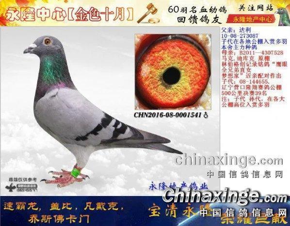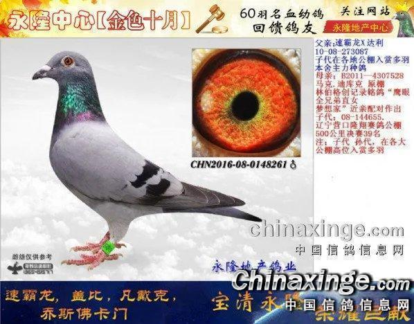 作品说明: 尊敬的鸽友,朋友你们好,首先感谢全国各界,爱鸽人士,对永隆赛鸽中心的,大力支持,关心,关注和厚爱,总经理-李真江先生在此表示真挚的感谢。注;应广大鸽友强烈要求,永隆地产鸽业决定,拿出60羽2016年高品质名血幼鸽,进行拍卖,回馈鸽友,拍卖大会与永隆赛鸽中心同时进行拍卖,机会不多,望鸽友不失良机,拍卖会时间定于2016年10月29日,地址:黑龙江省宝清县。公棚热线:13945781155