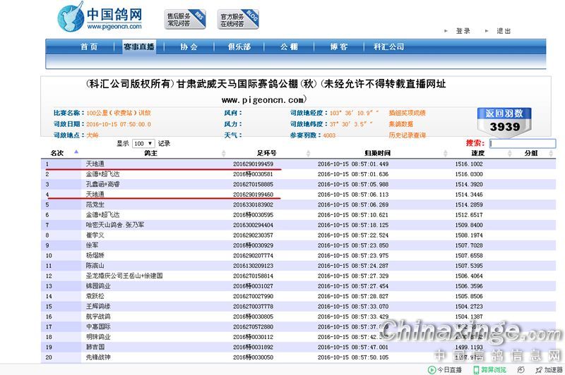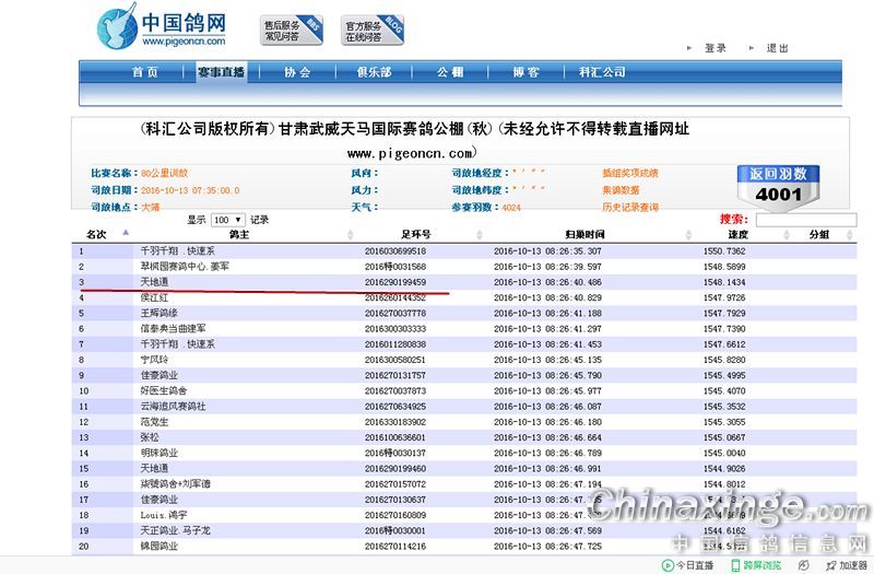作品说明: 又到了一年一度比赛的季节,协会,俱乐部,公棚,团队,现如今的赛鸽比赛是一年 比一年火热,一到比赛季节,也是有人欢喜有人愁,一年的的心血将得到体现! 现如今虽然比赛异常的激烈,但是依然有人可以做到“屠城”以及“大包揽”当然这 些都是协会和俱乐部才会出现的,作为现在的主流赛事“公棚比赛”出现“屠 城”及“大包揽”的现象几乎是不可能的,当然这主要是饲养方式的不同决定的!作为 公棚赛事,能在每关比赛入赏前十都非常不易,但不是不可能,近期在记录自己赛鸽训 放情况的同时,发现了武威天马赛鸽公棚的两羽“神鸟”可以说从10公里训放到120公里 训放几乎保持在前 十,并且还飞过两次冠军!不知后面的正赛180公里,300公里,500公里,神奇是否可以 延续??敬请期待!!