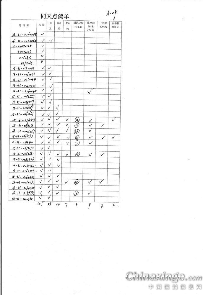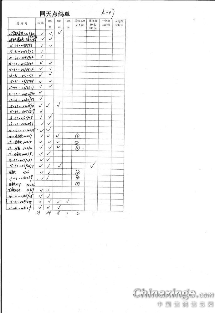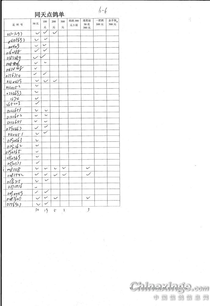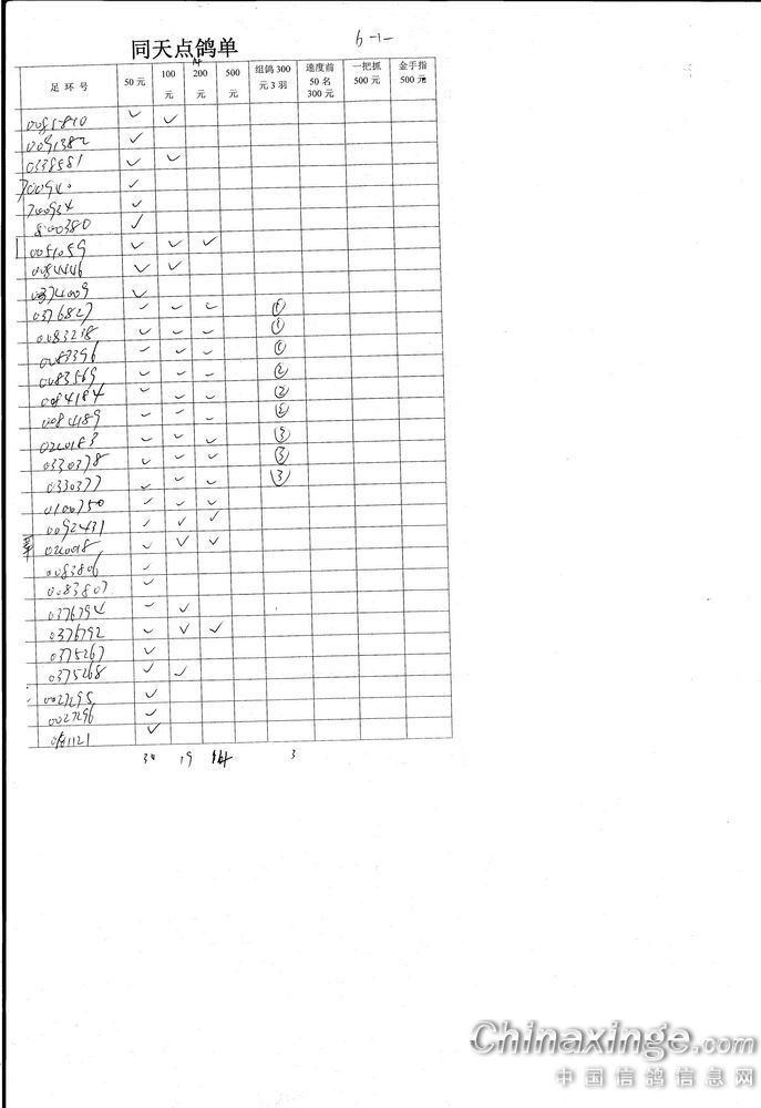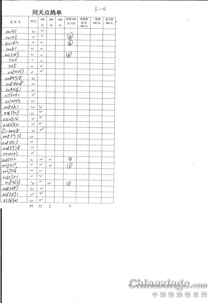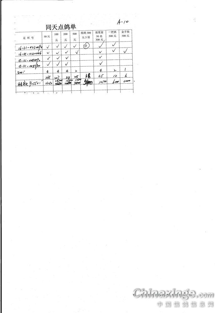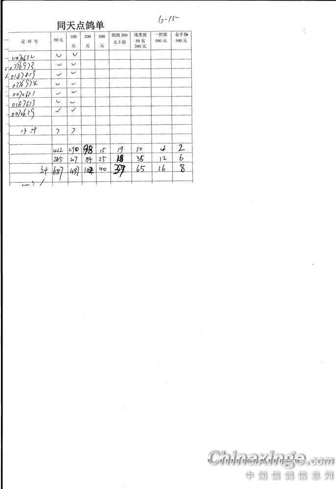 机关同天保底10万元大奖赛集鸽、点鸽数据