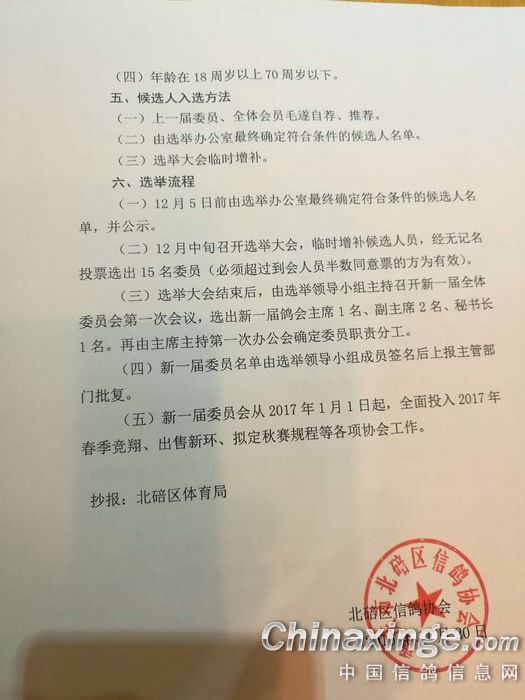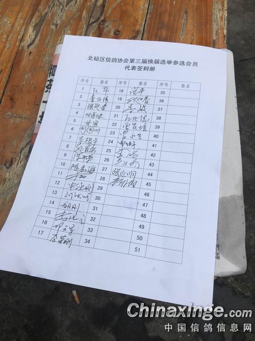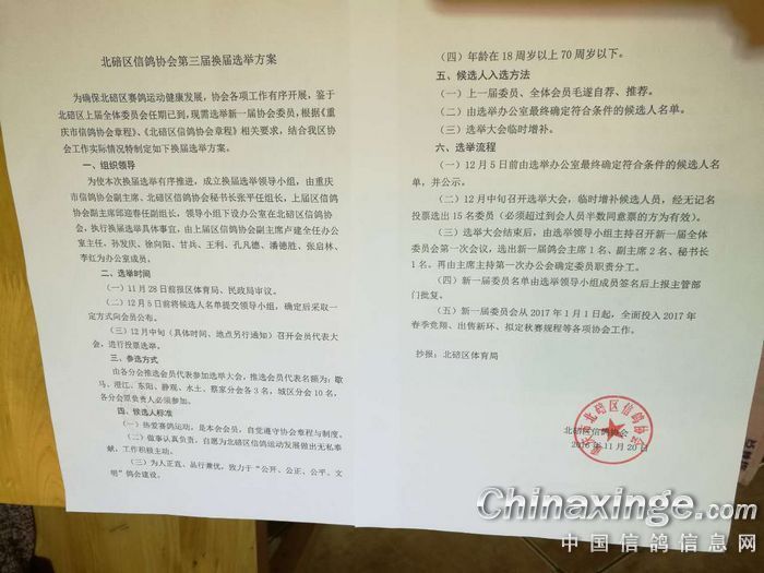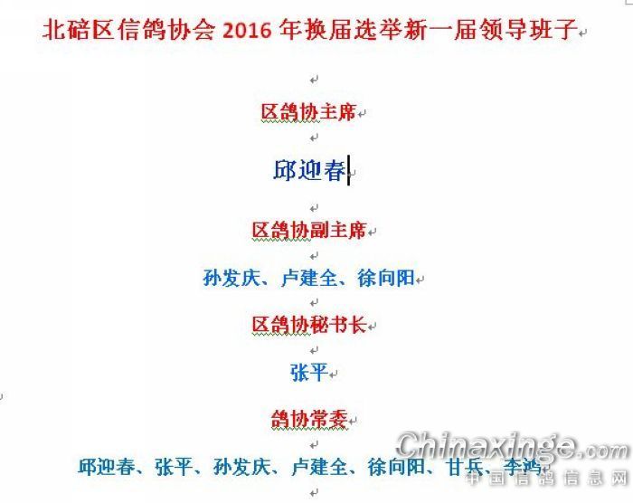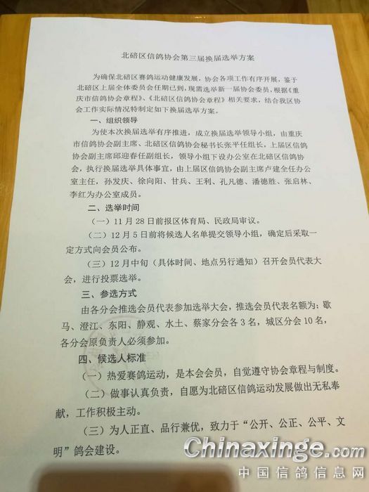 作品说明: 北碚区鸽协2016换届选举新一届领导班子于今日早上(9:30)在北碚区鸽协举行。北碚 区体育局艾科长亲临现场监督指导选举工作。北碚区鸽协会员代表到场行使自己的权 力。每一张选票都由会员自己填写,为自己心仪的候选人投上庄严的一票。整个投票过 程有序、公开。按照《北碚区信鸽协会第三届换届选举方案》的规定,由几位唱票人唱 票,鸽友代表监督每一张选票。选举结果当场产生。邱迎春同志全场最多票数(36票) 当选北碚区鸽协主席。张平同志全场(35票)当选北碚区鸽协秘书长。孙发亲同志、卢 建全同志、徐向阳同志当选副主席。以下是现场图片实况。