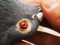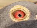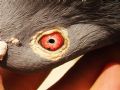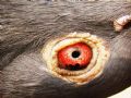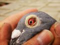 作品说明:  去年的时候,一只环号为07-24-501698幼鸽落入一朋友的鸽棚,教乖后今年春训放了几站并参加了500公里比赛,这只游棚鸽开笼后第二天归,今发现这只雄鸽两眼有象黑色沙粒一样的东西,翻转头部后这些沙粒会象流沙一样流动沉淀.今拍成照片给大家评评,看这种鸽眼在别的地方是否也存在.