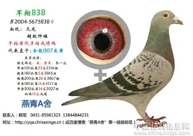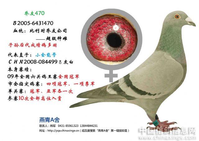 作品说明: 代表直子.2007-07-037007♂灰 本身成绩 市会150公里23名.参羽数赛2516羽 一汽150公里44名.参羽数赛900羽 市会150公里指定鸽A组冠军.57名.参羽数赛3702羽 精英180公里5名. 参羽数赛3865羽 市会180公里指定鸽A组亚军16名.参羽数赛4127羽 火车头180公里37名.参羽数赛2629羽 精英200公里26名.参羽数赛3867羽 一汽230公里47名.参羽数赛1000羽 一汽230公里64名.参羽数赛900羽 市会300公里14名指定鸽A组季军.参羽数赛3027羽 此鸽有效比赛成绩19次。 代表直子.2008-07-084499♂灰白 本身成绩 全国短距离六关鸽王赛 全国一位 09春一汽100公里 25名 1000羽 09春市会120公里1 排名赛亚军(市区内第一分速)3526羽 09春市会120公里2 排名赛96名 3612羽 09春市会180公里 16名 4127羽 09春市会230公里 总冠军.指定鸽ABCD.各组总冠军.3163羽 09春市会300公里 40名 3027羽 09春市会300公里 A组指定鸽季军63名 2977羽 高位入赏10次。