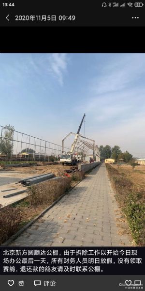 作品说明: 顺义新方圆顺达公棚,所谓拆迁,收鸽之前就是破架子,找个吊车摆拍玩