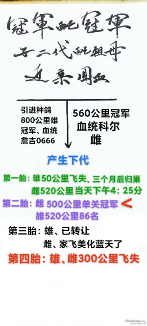 作品说明: “冠军配冠军成功靠远亲”存在的问题与挑战: 指出“冠军配冠军成功靠远亲”并非必然能培育出冠军后代,它只是在实战中的大数据显示成功概考率高于其它配对。它依然面临着诸多问题与挑战。由于竞翔性能受多基因控制,冠军赛鸽的基因组合可能并非最优,显向基因靠前並非百分百,所以,在配对过程中可能出现基因冲突或无法有效整合其它基因的情况。此外,若两只冠军赛鸽存在较近亲缘关系,采用“冠军配冠军”的方式就会加剧近亲繁殖的负面效应,导致后代体质下降、抗病能力减弱等问题。同时,环境因素对赛鸽竞翔性能的影响也不容忽视,即使拥有优秀基因的后代,若在生长发育过程中缺乏适宜的环境条件,也难以充分发挥其竞翔潜力。