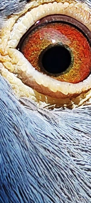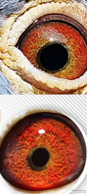 作品说明: 2023年的秋赛、会员曾跃武斩获第七名的好成绩,万万没有想到第七名的同窝妹妹都却飞了个“拖拉机”的“奖杯”,会员都说该迟归鸽的育种价值高于哥哥第七名。于是,我仔细分析同胞兄妹俩的眼睛才发现有质的大不同。 一、虽然都是黄眼且都来得油分适中,但妹妹的面砂依然不能与其哥哥比美,不看不知到,一看吓一跳。 二、“拖拉机”的面砂大呆板而不透气,且砂型没打开面格外显得没有力度。 三、“拖拉机”的面砂没有立体感和血丝的组团分布表现。 四、“拖拉机”眼志开口线虽然在同一点位“5至9”点,毕竟是同一父母产生。 五、“拖拉机”的眼志在后脑区挂彩乞点血丝,也的确有育种区域实用价值,但比起它七名的哥哥就远没有它漂亮。 六、“拖拉机”的哥哥第七名从各方面都来得比妹妹漂亮,最有特色的是眼志扣紧瞳孔有力度,再加上完美的三线锁边漂亮到了极致。 其实,斩获第七名之前也有过有惊无险的故事,半岁时第一次私训200公里它飞了一个星期,当时伤透了我的心,但我永远相信它一定会回来,因为它是台鸽的下代,有着强烈不死必归爱拼的神。接着市快200公里验资时我万万没有想到分速1880分/千米,该表象也许是马玉琛老师说的显像基因靠前吧!