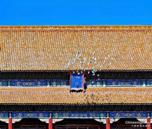 红墙飞雪群鸽振翅