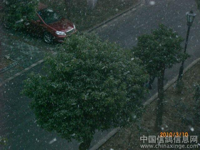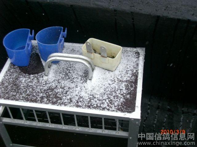 作品说明: 差不多已经过了数九的日子了,惊蛰这个节气也过去好几天了,不想今天老天爷却来了一出2010年三月的第一场雪,想来有些奇怪,看来今年的天气在数次地震后变得有些不可捉摸,对应这样的天气,在接下来的育种过程中是否要考虑到多用一些稳定的鸽系呢?不得而知,其它不谈,今天是我扩棚后的第一场雪,倒是值得纪念的!