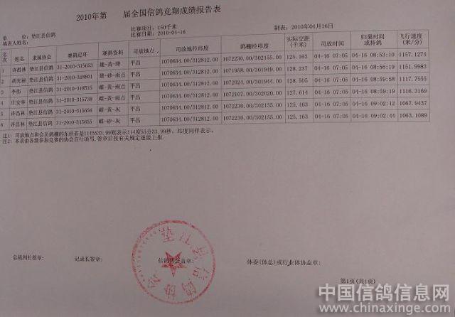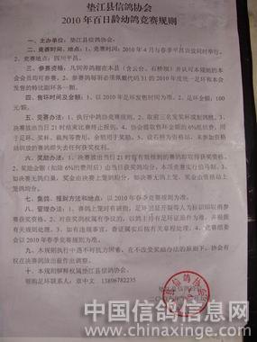 作品说明: 重庆垫江平昌百日龄特比环报到颁奖花絮 (今日协会快讯)重庆垫江县信鸽协会,2010年春季幼鸽百日龄特比环赛,百日龄点鸽一把抓赛,四川平昌130公里决赛落幕。4月15日20~23时集鸽,16日7时05分在平昌开笼放出。8时53分冠军率先归巢,8时59分前三强赛结束,最快分速1157米/分。晚上21时前,当日归巢特比环赛鸽平分奖金。当日21时前共归巢18羽。一名:许昌林;二名:胡光禄;三名:董敏。百日龄点鸽一把抓:胡光禄。 集鸽地点:垫江县翔友赛鸽俱乐部 司放地:四川平昌 司放坐标:纬度:107°06'34";东经:31°28'12"。 空距:130公里 当天天气:晴 集鸽: 刘天成 程庆华 司放:文 川 张定坤 奖金发放地点:垫江县翔友赛鸽俱乐部