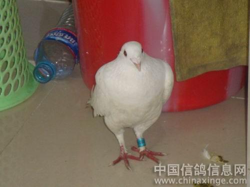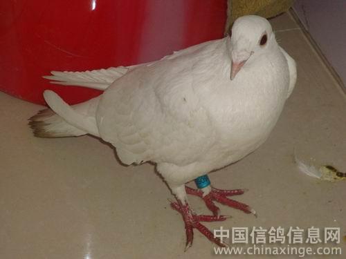看得出这是一只被人剪过翅膀的白色信鸽。脚上的足环就是他的身份证明,年份-地区代码-足环号。