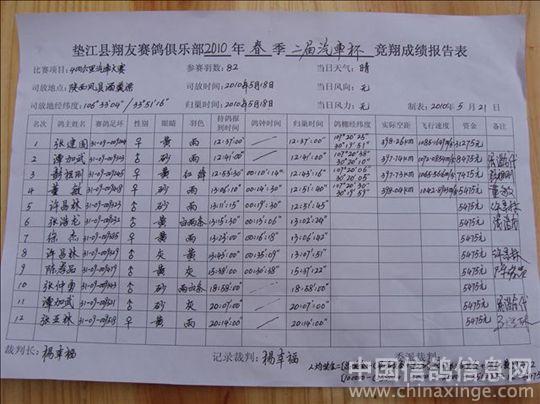 作品说明: 第二届QQ汽车赛特比环颁奖花絮 重庆市垫江县翔友赛鸽俱乐部,第二届QQ汽车赛特比环颁奖,于2010年5月22日上午在垫江县翔友赛鸽俱乐部举行,参加颁奖会的来自12位获奖鸽友以及委托领奖鸽友。前往参加的还有其他鸽友。 颁奖现场:1.对前三名进行验棚。 2.所有获奖鸽必须出示环标证。 3.对获奖鸽再次进行身份验证。 4.进行现场颁奖、颁证。 冠军奖金为:31275.00元。平均每羽分得5475.00元。该次赛事在公平、公正、没有争议的情况下,画上了一个圆满句号。预祝2011年第三届QQ汽车赛取得圆满成功!插曲:由冠军得主,张建国请客,《今舟鱼府》用餐。 本赛事感谢张浩龙和张建国鸽友提供赞助,感谢各位鸽友辛勤工作。