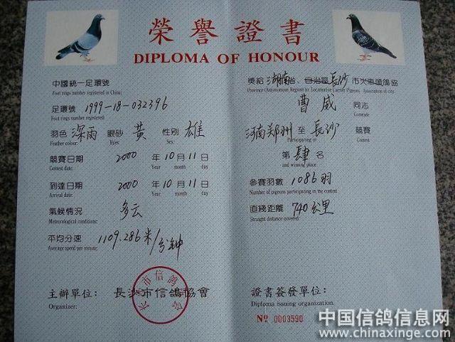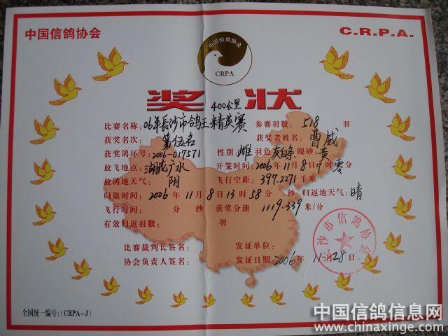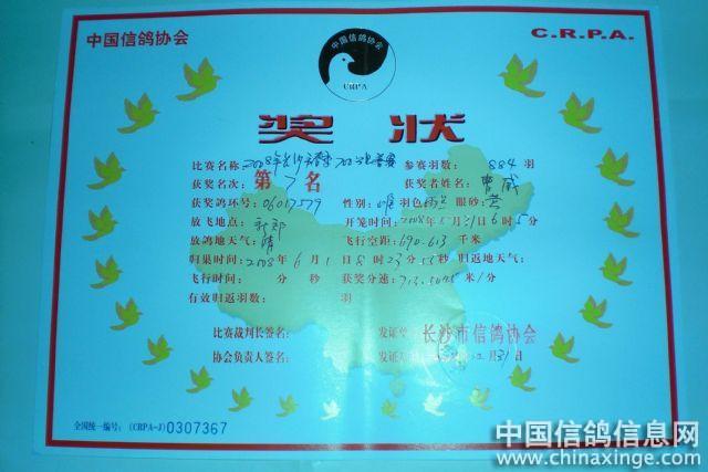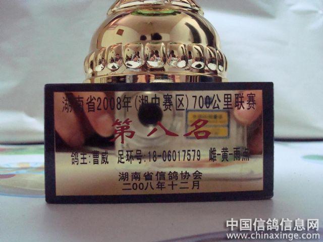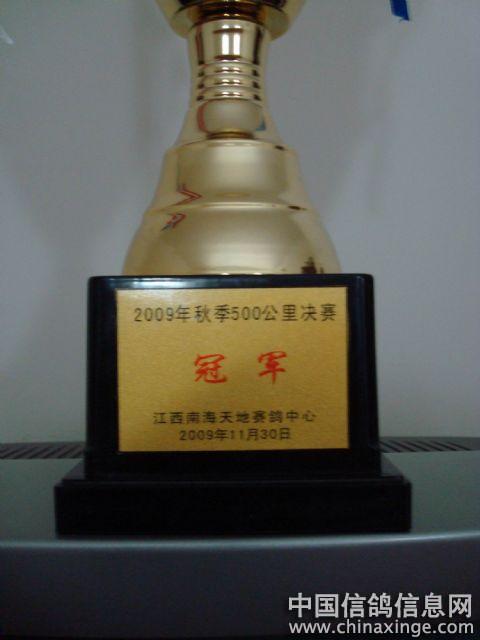 2009年秋湖南长沙曹氏父子鸽舍 一举获得 2009年秋江西南昌南海天地赛鸽公棚500公里决赛总冠军!!!(天气恶劣,阴冷,总集鸽5753羽,决赛上笼1168羽,飞得很惨)并且决赛冠军同时获得230公里预赛33名,综合鸽王冠军,湖南地区冠军!获得奖杯一樽,奖牌一块!!!