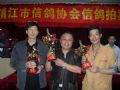 作品说明: 靖江市信鸽协会2012年春季拍卖会于5月19日下午顺利召开。此次拍 卖会共有30羽高位入赏鸽参加;其中双关鸽王冠、亚军分别以2万 元、1.2万元的价格被鸽主自己拍回。靖江电视台专门为这次拍卖会 制作一期节目,并派记者全程采访。 2012年春季靖江市信鸽协会以组织了3场比赛。第一场350公里(宿 州站)江苏小上海鸽舍获得大胜,取得综合、百日赛两座冠军奖杯; 赛鸽豪强周涛获得综合2、3名;赛鸽高手缪国民拿下综合4名、百日 赛亚军;靖江赛鸽常青树夏永华取得百日赛3名。第二场500公里(商 丘站)由江苏小上海和缪国民所主导,前10名除亚军被徐智键夺得 外,剩下的9个名次被二人瓜分,前50名各进13羽联手拿下半壁江 山。双关鸽王江苏小上海取得1、3名,缪国民拿下2、4名。而到了第 三场700公里(郑州)国家赛风云突变,沿途遭遇恶劣天气,朱建明 异军突起夺得1、3名;远程好手刘和松获得亚军。