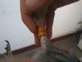 作品说明: 今天中午12:40和同事正准备去吃饭发现单位门口有只鸽子。仔细一看带着橙色的14年足 环和一个黑电子环。想应该是公棚路训的鸽子。我就走过去赶它起来,但是它只能走飞 不起来了。应该是受伤了。就把抓了起来才发现它的翅膀受伤羽条杂乱,这样的鸽子我 是不会拿去训放,家飞都困难。对着环号查了下我们这的春棚。是大爱飞天的鸽子找到 了鸽主的名字《伊犁铁人鸽舍》。希望它主人能看到2014-30-311106。