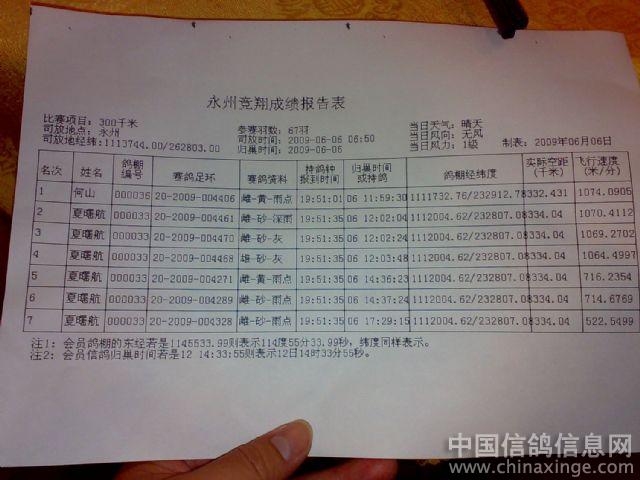 作品说明: 柳梧对抗赛二边发环500,到决赛上笼不足一百,2009年6月6日决赛,梧州险胜柳州而完满结束,决赛充满戏剧性,柳州方面的鸽子先到,而梧州距离远鸽子后来居上,梧州第一梯队是哈利三羽鸽子同时到,不知从那里带回了四羽鸽子在棚顶上飞了十分钟才入棚,而冠军得主何山,鸽子直接入笼,打钟比亚冠快了三分钟不到,而空距比哈利近,要上电脑计算才分出胜负,冠军分速1074.0905为/亚军1070.4112米,以4米不到而夺冠,这是场分秒必争的比赛.