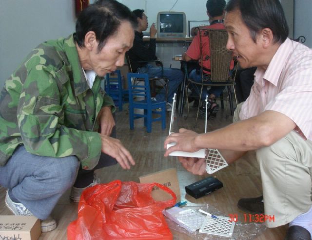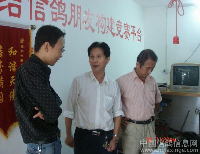 新民俱乐部的王忠祥总裁判长向会员介绍怎样安装赛鸽扫描计时系统。