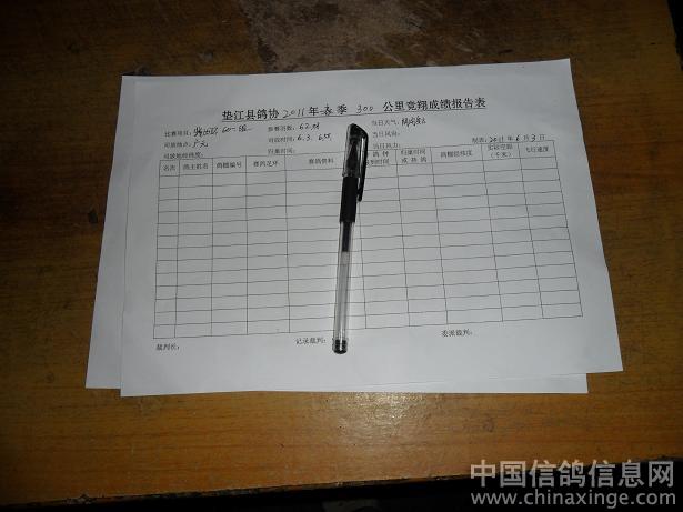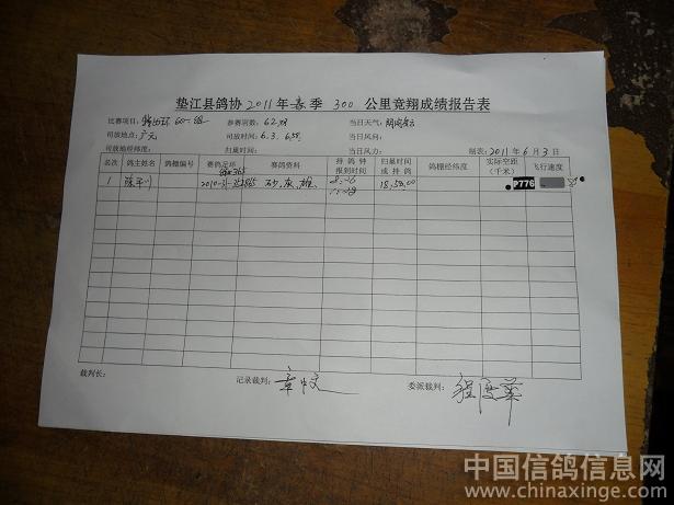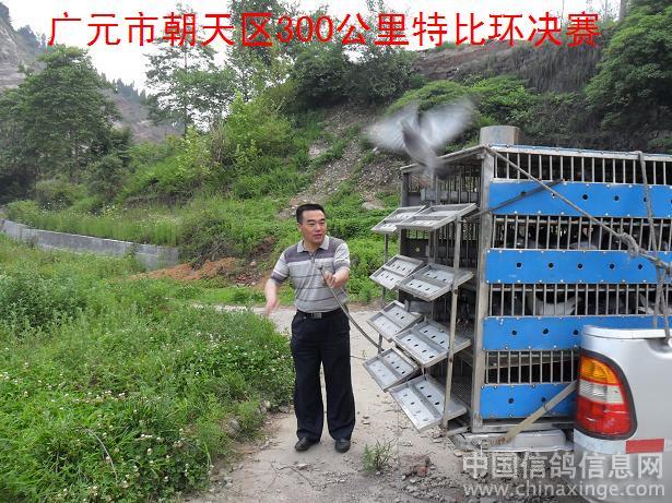 作品说明: 朝天决赛结局—伯马与平分 赛鸽车于2011年6月2日19时从重庆垫江县出发后,经过8小时的颠簸,完成了直线300公里的行程。于2011年6月3日3时到达司放地点,四川省广元市朝天区。驾驶员安心睡觉,两位司放员轮流看护,时间分分秒秒过去,赛鸽休息了4小时左右,晨光照亮了朝天,赛鸽在司放裁判的精心加水后,7时开笼了,一群给鸽友带去黄金梦想的精灵,腾空而起,几个回合就分道扬镳了,由于没有群体优势,只要带头鸽定位误差,顺嘉陵江而下,或者进入“汉中平原”那情况十分危险……。这边重庆市垫江县鸽友,废寝忘食,望断双眼,盼鸽回……。真是一江春水向东流……。幸运、财运在19时发生,周嘉区乡镇参赛鸽友陈平川的一羽60元特比环(小特比)归巢了,到今日21时有效时间内,归巢一羽,获得了本次60元特比环伯马冠军。奖金“一把抓”。270元大特比零归巢,奖金由决赛鸽平分。300元点鸽平分。结束了本次“606”300公里特比环赛事。 赛事聊侃:一是缺乏群体优势,造成零归巢。二是多数鸽友用“外系”,作为山区遇阴雨天气,归巢零。今天伯马血系为赛阳(所谓四大国血之一)。三是主群定位问题,不知道是进入汉中市,还是到嘉陵江看风景,或者“齐聚朝天接驾”了……。颠倒阴阳,让鸽友遐想吧……。擦干眼泪,“606”再会。 司放地:四川广元朝天区 司放天气:晴天 无风 司放时间:2011年6月3日7时 空距:300公里 司放裁判: 李行权 陈 杰