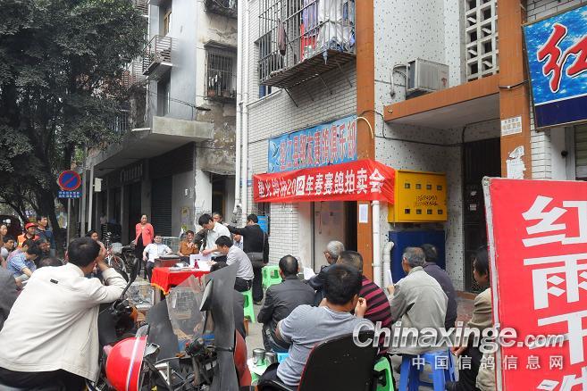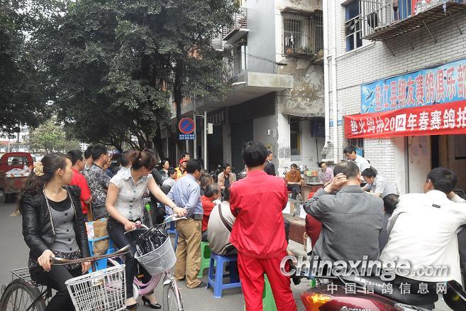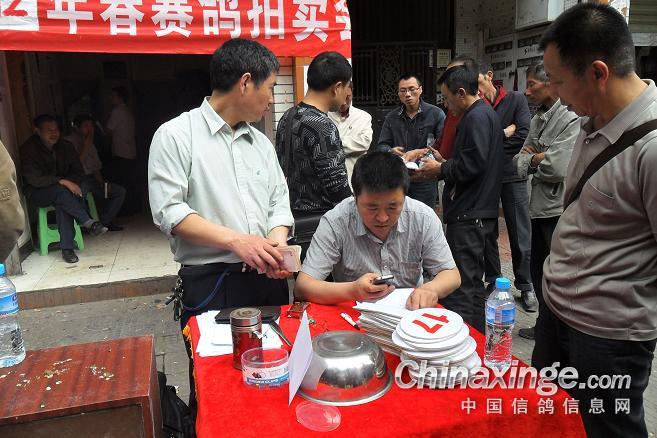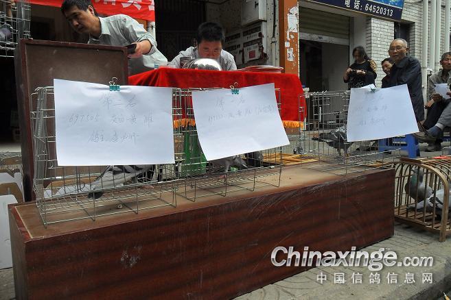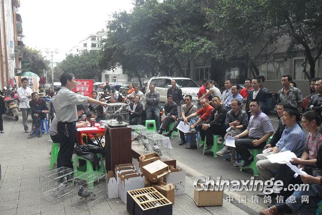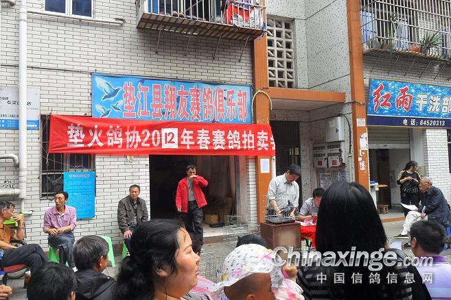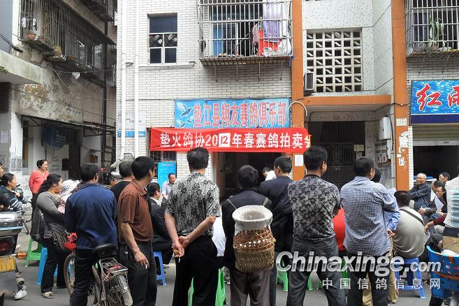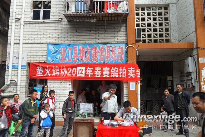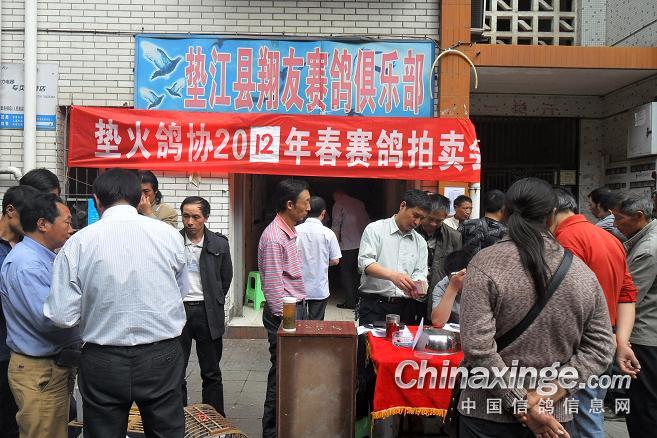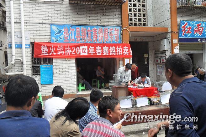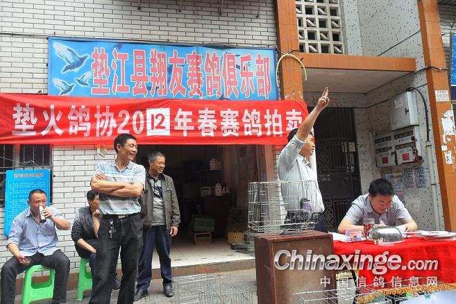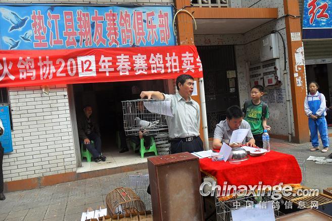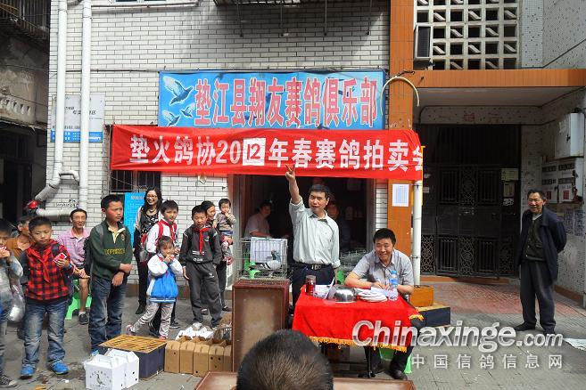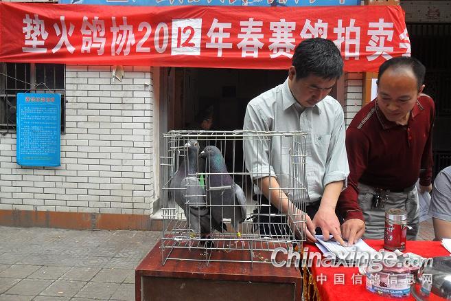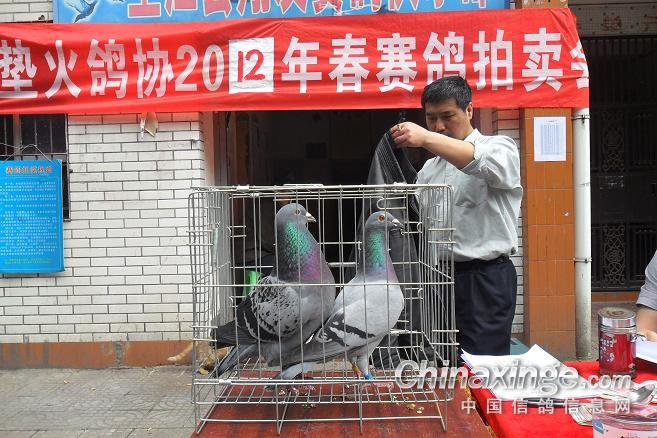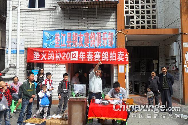 作品说明: 垫江火车头酒奠梁400公里决赛拍卖花絮 有鸽友评价认为:“海霸王仅飞平原,不飞高山”,重庆鸽友有不信邪的,2008年重庆垫江县有鸽友就引回10羽幼鸽,它们足环是CHN2008-19-190623 ;CHN2008-19-190627;CHN2008-19-190654;CHN2008-19-190602……。等。经过与地方成绩鸽杂交,它们子一代,孙代。今年参加了垫江火车头春季400公里陕西省凤县酒奠梁(秦岭南)特比环、通讯赛决赛。此赛于2012年4月21日拉开序幕,(已报道)。由于重庆难得遇上北方那么好的晴天,海霸王一显霸气。前10名,海霸王报进4羽,鸽主李必怀获得成绩是:亚军CHN2011-32-697505;4名CHN2011-32-697503;5名CHN2010-31-319229;8名CHN2009-31-055974。另外陈林获得40名CHN2011-32-697562等。 2012年4月25日下午14时开始,在这春意嫣然,风和日丽的重庆市垫江县翔友赛鸽俱乐部门前,聚集了重庆铁路信鸽协会垫江站(区)信鸽协会会员,兄弟鸽会会员,临近梁平县鸽友,俱乐部鸽友,在这具有重庆垫江特色的“坝坝拍卖会”上。他们举牌示价,拍卖自己心动的赛鸽。拍出桂溪河畔的喜悦心情……。 今年春季赛事,气温忽高忽低,造成当日归巢仅为15%左右。但是参拍现场,依然显得有些“火爆”,战败者没有失去“失败”的信心,并且以良好的心情参加了这样的“拍卖会”,会员田老么,一气拍下5羽成绩鸽。正如;杨传道的“关门弟子”,火车头垫江信鸽协会主席—张国荣,(不是香港的张国荣),赞扬田老么道:“明年优异的成绩是你的”……。拍卖会迎来了多数市民和学生参加顶场,使场面关机火爆。 由于垫江属山区县,经济比较落后,冠军鸽才以5000元人民币的身价,被鸽主—庄安华自己拍回。没有赶上参拍的外来鸽友只有私下与交易了……。欢迎外地鸽友来交流指导。 拍卖会完毕,获奖鸽友领取了自己的奖金。晚上18时~20时由海霸王鸽主亚军获奖鸽友李必怀校长在“江湖123”举行了答谢部分鸽友晚餐。并进行了友好经验交流。拍卖会取得圆满成功! 重庆铁路信鸽协会垫江站(区)信鸽协会,春季陕西省秦岭400公里赛事,今天画上了圆满句号。下次5月赛事再会,祝今后赛事越办越红火!