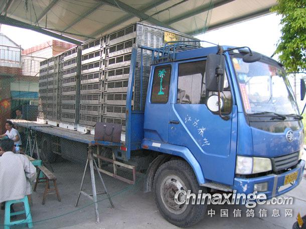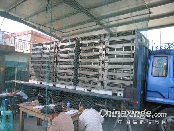 宽敞的集鸽大厅、不锈钢集装箱、运鸽货车严阵以待.
