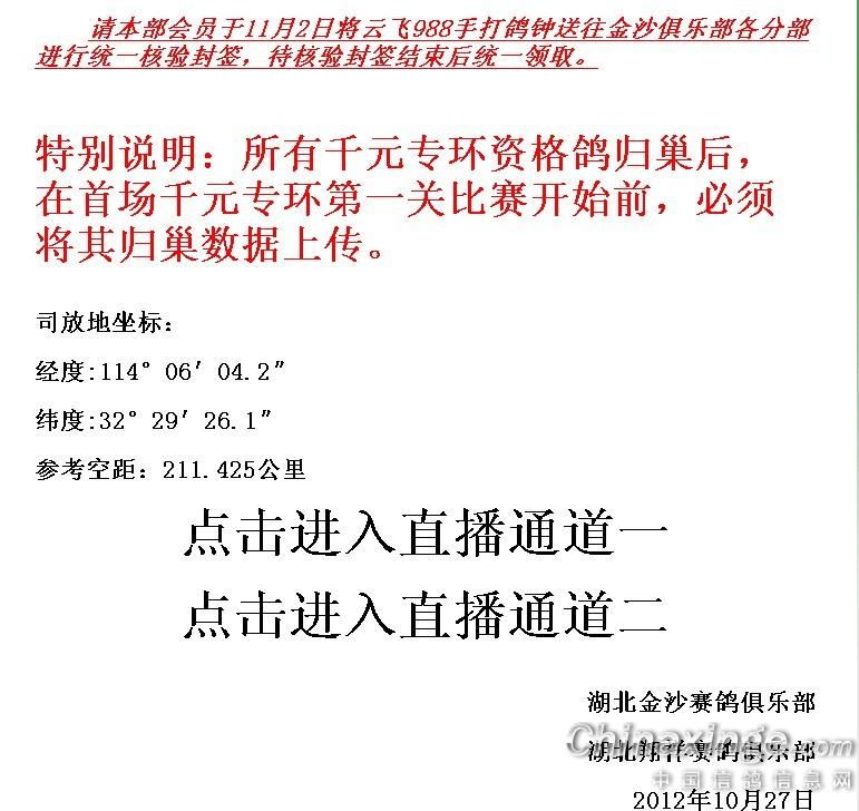 作品说明: 武汉金沙赛鸽俱乐部公布的第四届千元专环的游戏规则:-------------------------------------------------------------------------------- 特别说明:所有千元专环资格鸽归巢后,在首场千元专环第一关比赛开始前,必须将其归巢数据上 传。 湖北金沙赛鸽俱乐部 湖北翔祥赛鸽俱乐部 2012年10月27日 截止2012年11月9日18时16分,千元专环资格赛 有效归巢:2608羽 。 ----------然而“2011年11月10日晚武汉金沙赛鸽俱乐部千元专环第一关集鸽数居然达到2685羽,比千元专环资格赛有效归巢数2608羽多出77羽,请问这多出来的这77羽参赛鸽从那里冒出来的????”