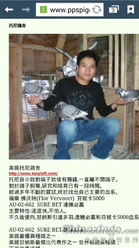 托尼!你好!人品好看得出来! 你的鸽子!霸道!血统正!能缘鸽友的冠军梦!。百世恒永远都在追寻世界最顶尖的鸽子,从一开始远赴欧洲访名家,买铭鸽。搜罗像亚精顿、蒙托邦、奥灵久等景点国家赛的冠军鸽,亲身体验全球最著名的国际赛——巴塞罗那国际赛,并引入国家赛冠军。随着引种的深入,直到锁定一个世界公认的顶尖鸽系——奥林匹克之王福勒沃尔沃特的“芬尼卡5000”。经过多次欧洲拍卖会上的不懈努力,终于将这支举世闻名的王牌鸽系收归账下,百世恒的终极目标是通过艰苦的赛事,培养出属于中国的“芬尼卡5000”王朝。一 一∫ 托尼!哥!你的鸽子!霸道! |